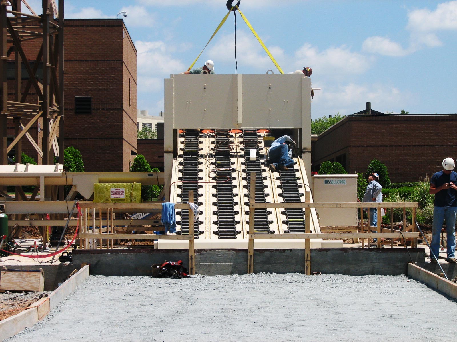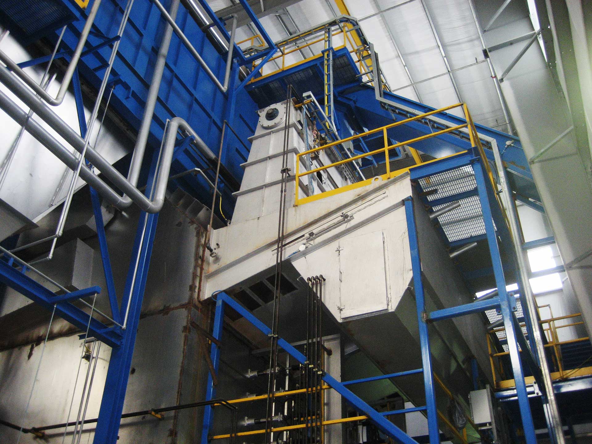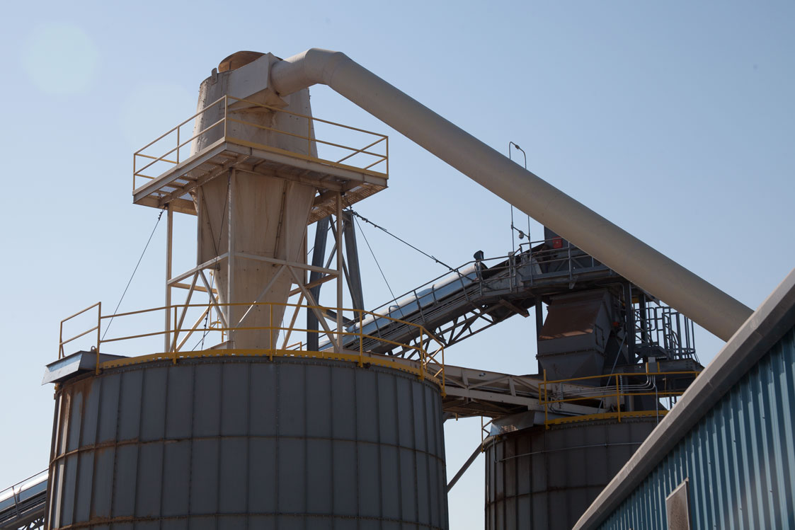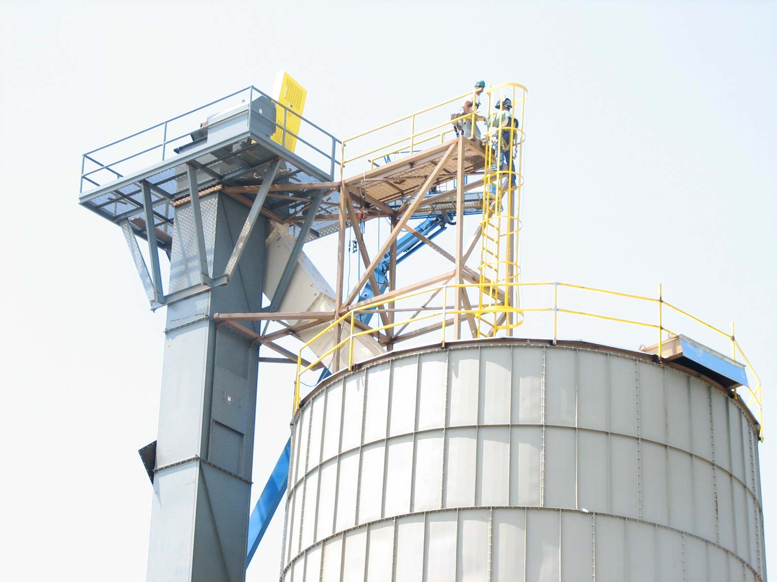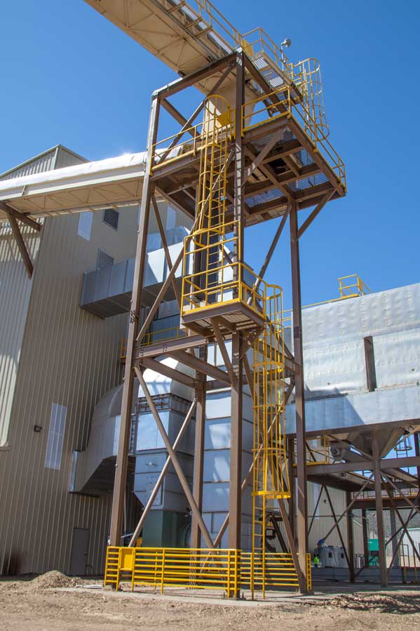 Centrifugal type, continuous belt, bucket elevators are available with Wellons fuel handling systems. A fabricated steel discharge chute delivers the fuel to the inlet at the center of the fuel storage silo roof or the live floor storage bin. Maintenance access to the conveyor head section is via caged ladder from the top of the storage silo.